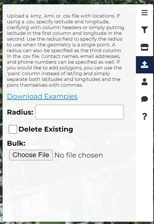 - As the instructions state, you'll need to upload either a .kmz, .kml, or .csv file with locations.